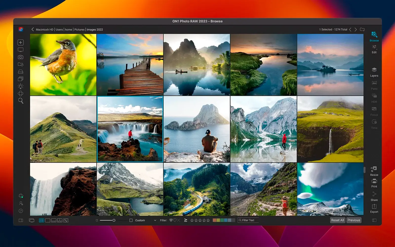 马上,在ON1 Photo RAW主窗口中,您可以轻松浏览图像集合并添加新的源图像文件夹。内置的图像浏览器使您可以预览照片并将其发送到其他工作区。