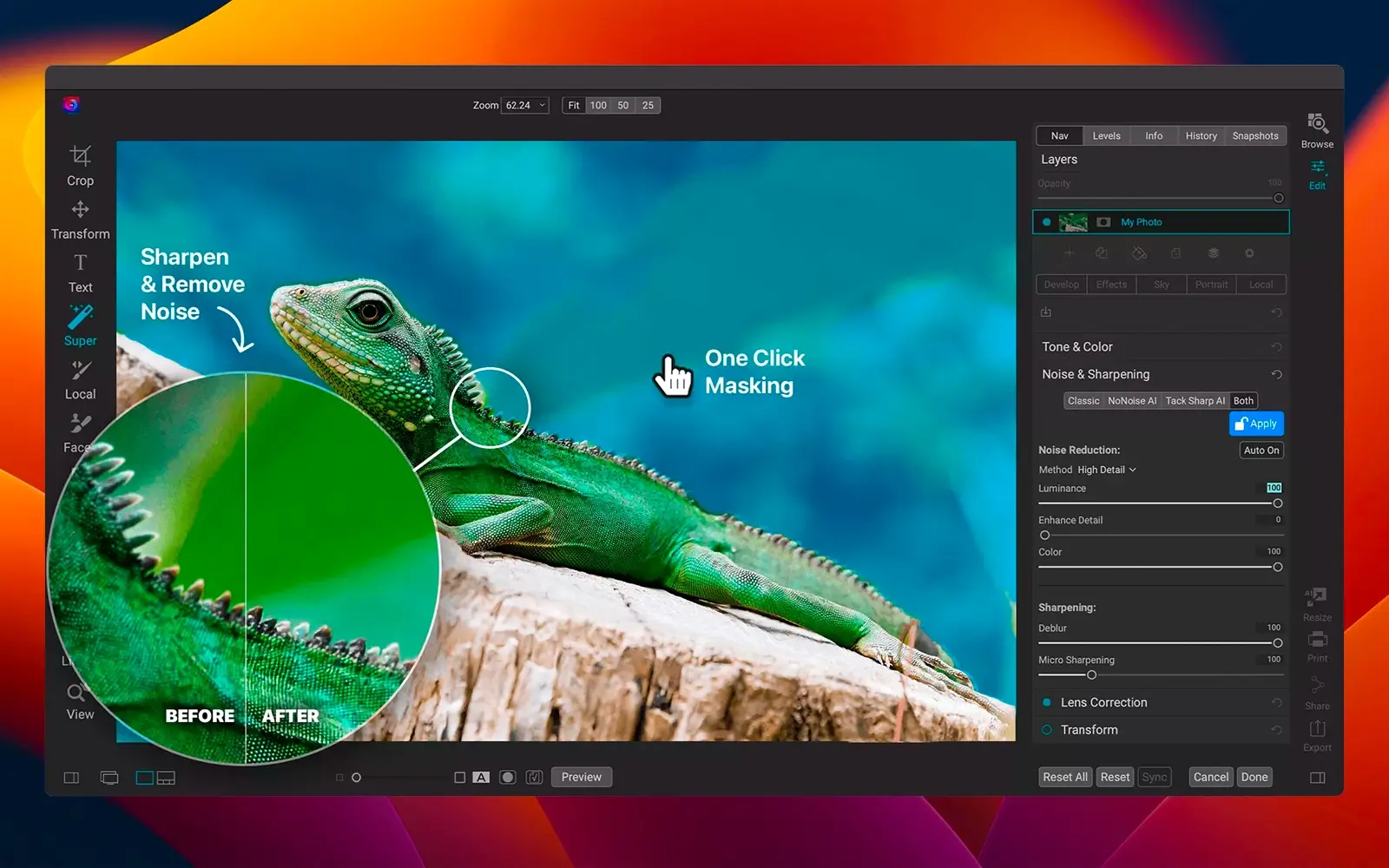 借助 AI 的力量,您的照片将看起来像您设想的场景。超越自动色调,让 AI 设置颜色和色调,而无需使用一刀切的算法。使用强大的 Brilliance AI 技术,轻松检测照片中的区域并自动应用局部调整,例如通过完全的用户控制使天空变暗或增强树叶。